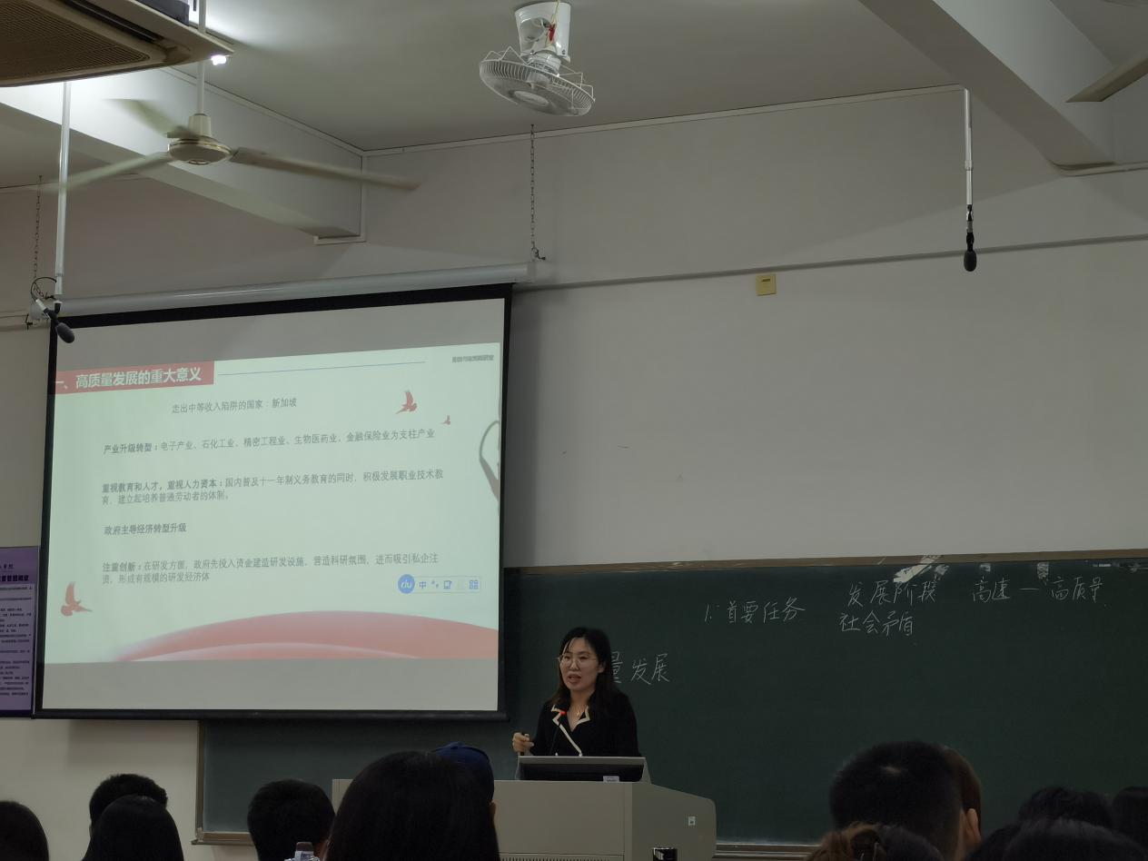 李智老师围绕“开创高质量发展新局面”专题,从高质量发展的重大意义、高质量发展的内涵要求、高质量发展的战略部署等三个方面展开,系统地讲述了发展是党执政兴国的第一要务。通过本次授课,学生了解了我国前些年高速增长和现阶段高质量发展的区别,深刻地认识到我国发展仍处于重要战略机遇期,只有把质量发展放到更加突出的位置,才能赢得主动、赢得优势、赢得未来,不断书写高质量发展新篇章。要勇于担当社会责任,扛起时代新使命,在高质量发展的新征程中贡献青春智慧和力量。