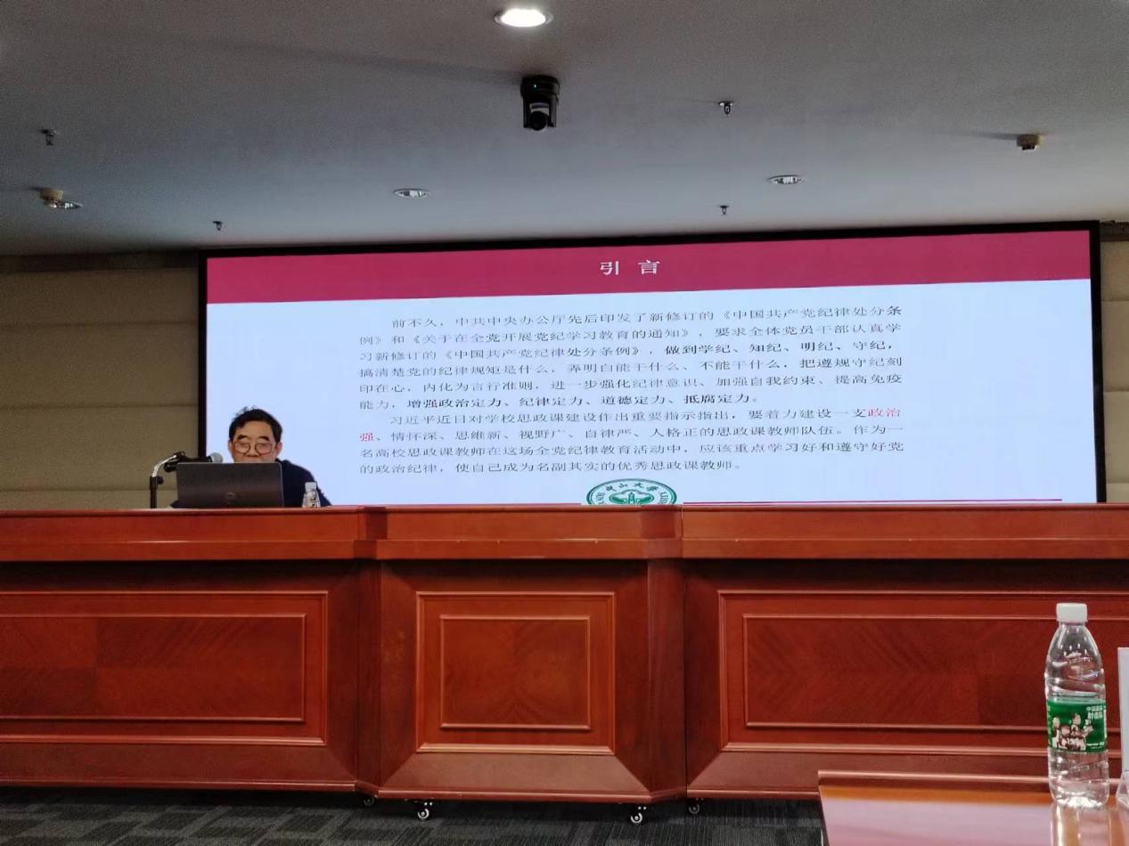 讲座中,郭文亮教授结合自己多年的学习和研究体会,用生动的案例,从《中国共产党纪律处分条例》修订的时代背景与意义、政治纪律的内容、如何在思政课教学中严格遵守党的政治纪律三个方面进行了深入讲授。