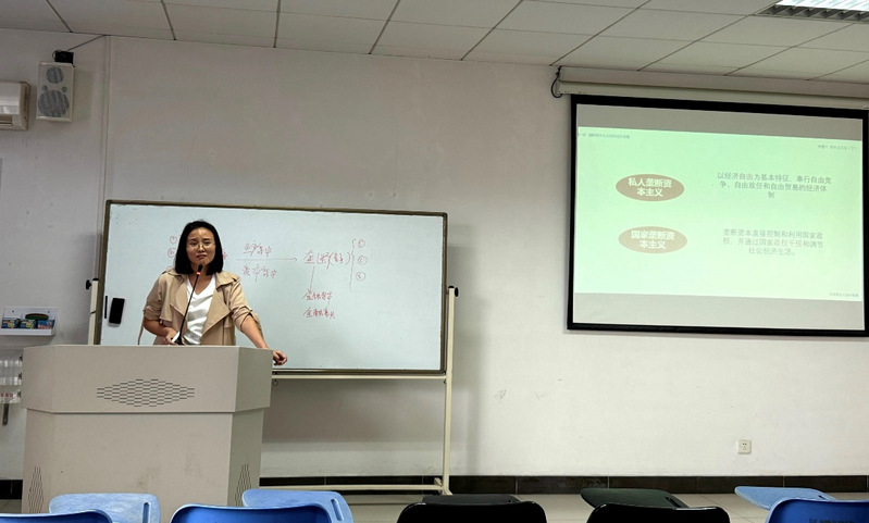 接下来,杨丽丽老师向与会教师模拟了专题六第一节“垄断资本主义的形成及发展”的现场授课。她以问题导入的方式,从资本主义自由竞争的发展入手,引出垄断的概念,并结合生动的视频、案例分析了垄断产生的原因、垄断组织、金融寡头、国家垄断资本主义的形成过程等知识点,逻辑清晰,内容完整。