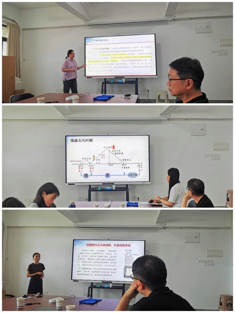 本次会议邀请广州商学院马克思主义学院院长杜奋根教授担任指导专家。会议由教研室副主任黄忠瑶主持。教学质量提升会以说课的方式进行,针对课程重要章节进行教学内容介绍,重点展示课堂导入、师生互动等教学设计环节。王田田老师率先进行《铸牢中华民族共同体意识》的“第六讲-中华民族意识觉醒及中华民族新选择”,赵晶老师则针对“第四讲-中华民族空前繁盛及中华民族内聚发展”,曾丽华老师聚焦“第五讲-中华民族大统合及中华民族格局底定”。