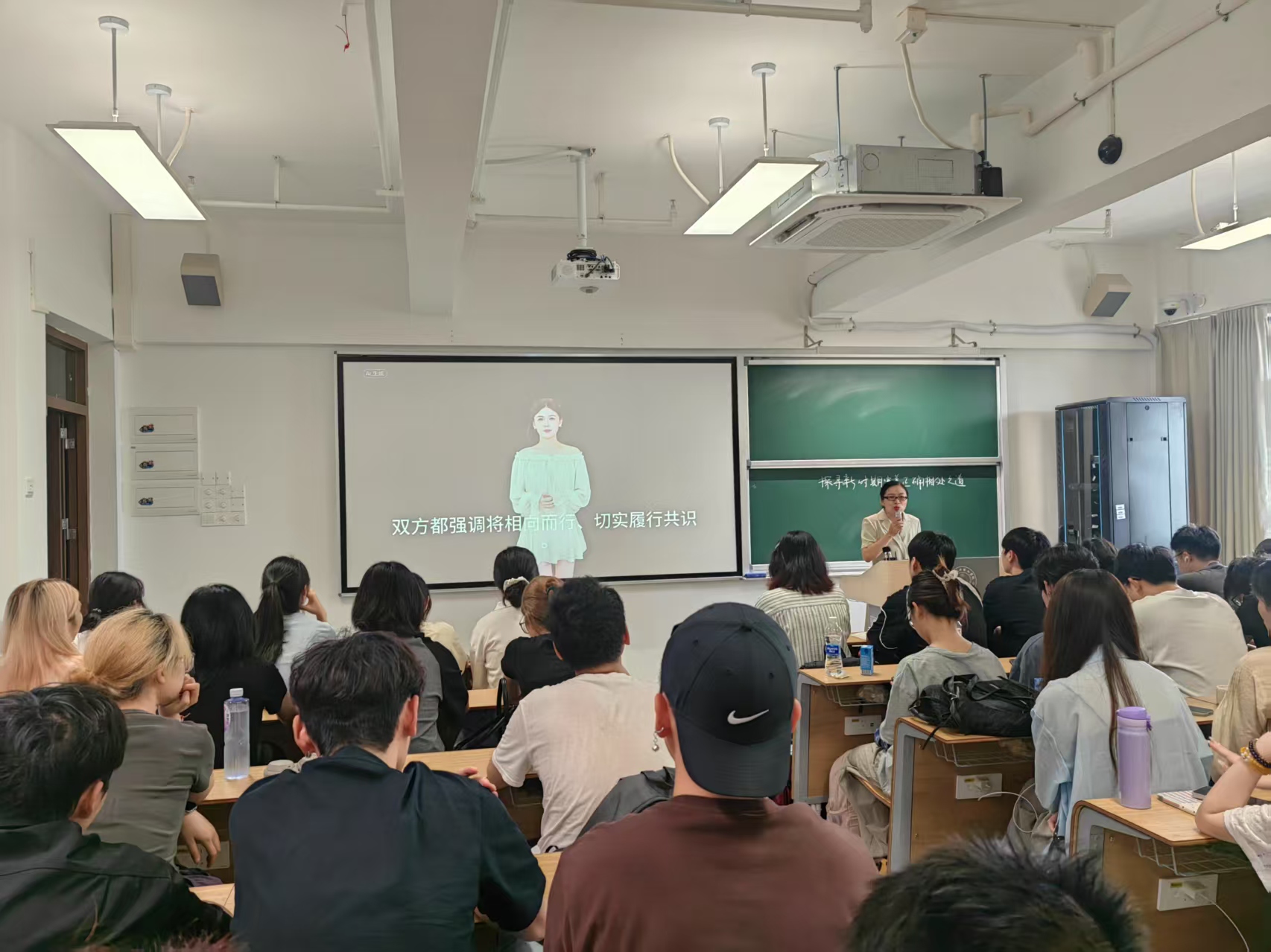 “6月9日至10日,中美在伦敦举行经贸磋商机制首次会议,国际媒体给予密切关注。”上课伊始,任课老师邹春梅以虚拟数字人进行新闻播报的形式巧妙切入《探寻新时期中美正确相处之道》这一授课专题。虚拟数字人的闪亮登场,瞬间提高了学生的学习积极性和注意力,增强了思政课的数字味道。