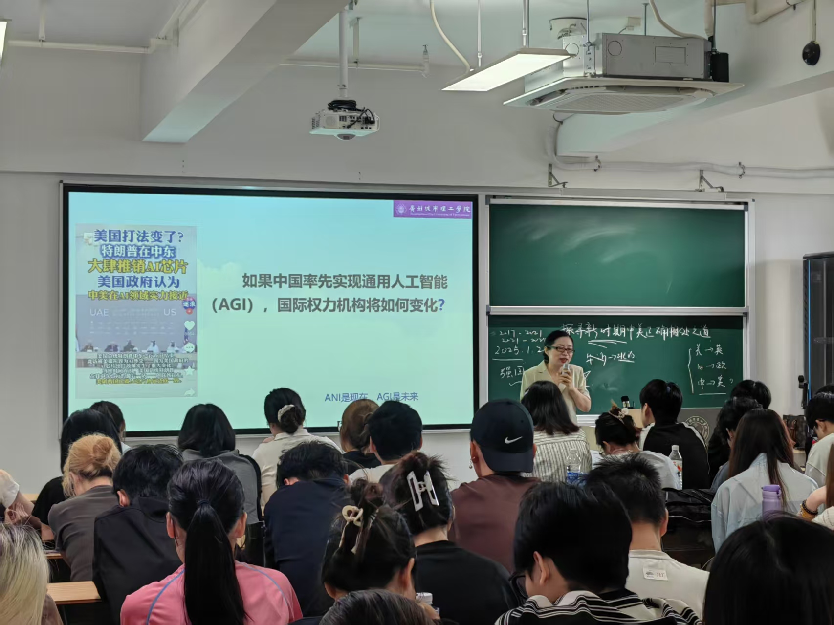 授课中,当阐释中美关系经历波折的根源时,邹春梅老师以美国政府今年五月在中东大肆推销AI芯片为例,请同学们小组探讨“如果中国率先实现通用人工智能(AGI),国际权力机构将如何变化”,以开放性话题激发学生的学习兴趣和探索欲望,引导大学生正确看待中美关系,进一步明确中美关系是世界上最重要的双边关系之一,中美如何相处,既关乎两国人民福祉,也关乎世界前途命运。