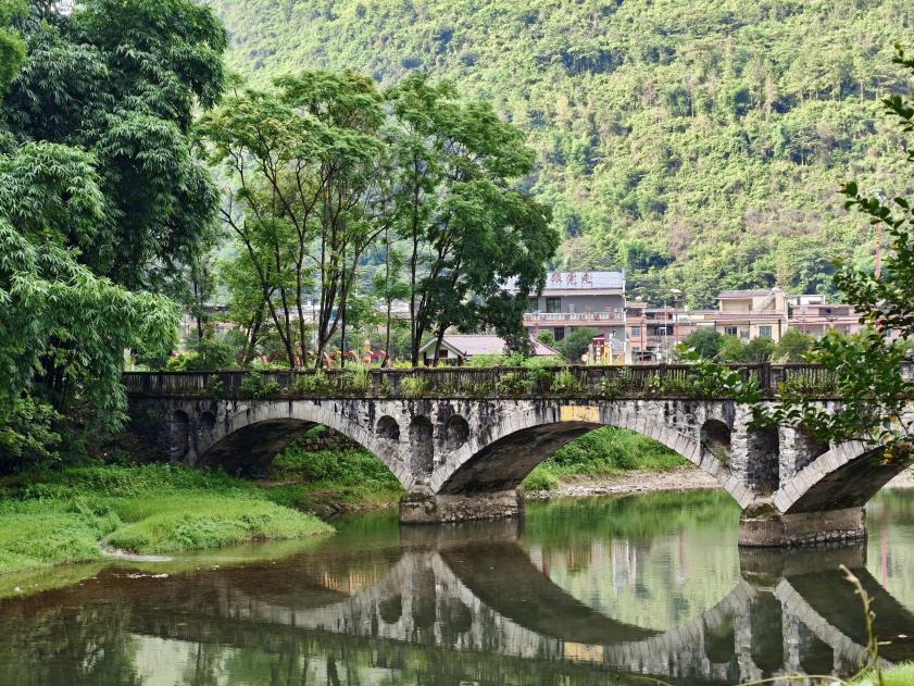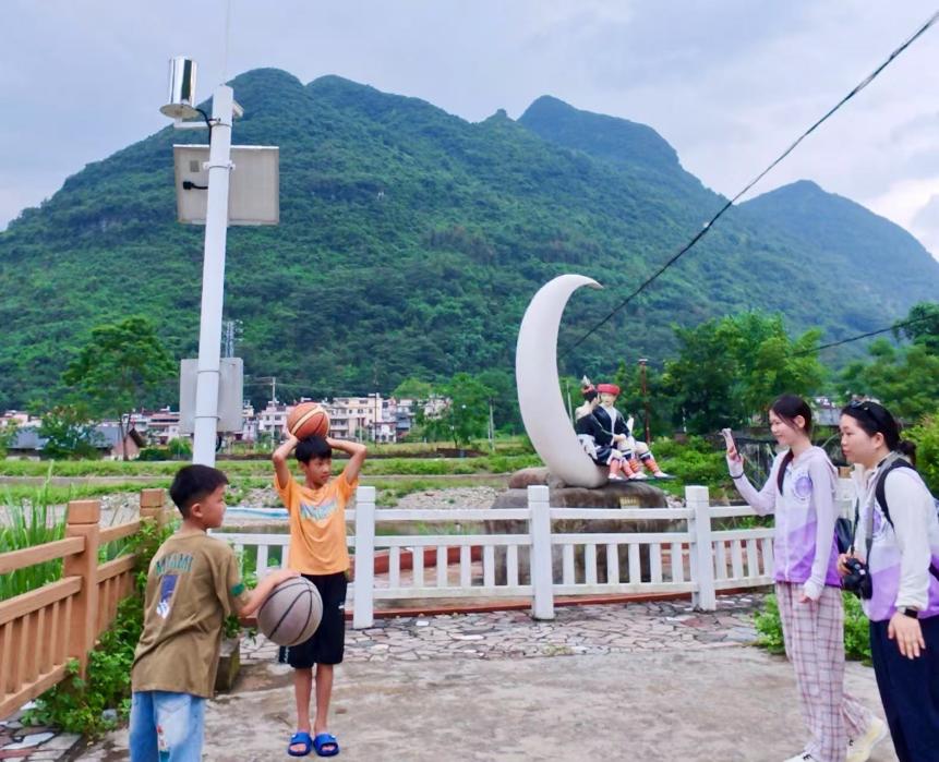 当日下午,团队转赴新寨村接着进行拍摄任务。 沿着村道前行,房屋外墙上绘制精美的瑶族元素墙画吸引了团队的目光。墙绘上长鼓舞的矫健姿态、九寨河上放竹排对山歌的生动场景,被一一纳入镜头,成为宣传片展示瑶族风情的重要视觉语言。在月亮湾公园,团队成员与在公园嬉戏玩耍的儿童交流,瑶族儿童还热情的教团队成员一些日常的瑶族语言,还讲述了他们当地存在着留守儿童的问题。到了古朴的九寨桥,团队记录了这份自然的纯净与宁静,九寨桥静卧于澄澈的水面之上,古老的石拱造型,历经岁月打磨,桥身斑驳散发着厚重的气息。桥畔绿树成荫,远处青山如黛,与错落有致的民居相映成趣 。碧水悠悠,桥的倒影在水中摇曳,静静诉说着新寨村这片土地的宁静与美好 。