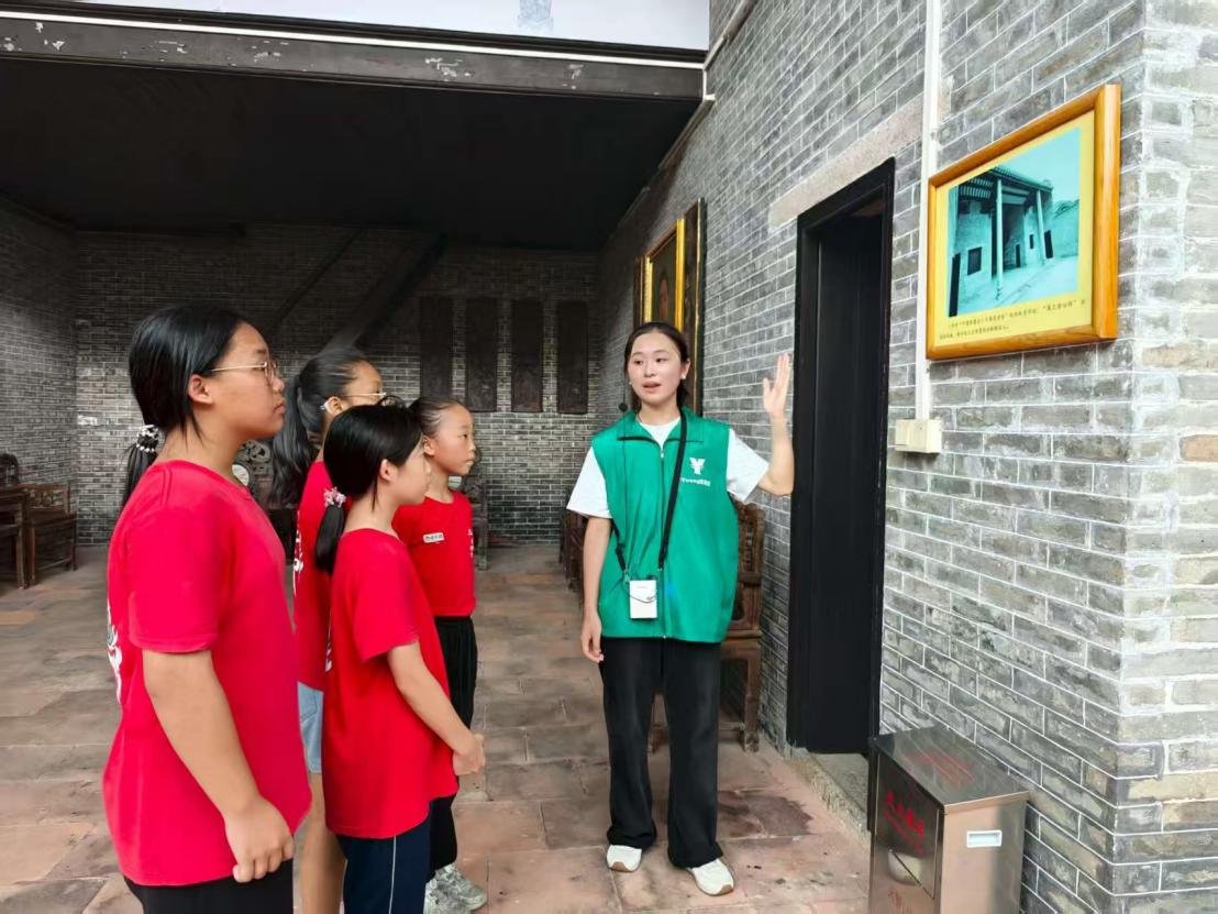 “同学们,匾额上的八个字——‘毁家纾难,功在党国’,是由孙中山先生亲笔题词的。1920年,孙中山先生为褒奖黄花岗起义英烈的革命精神,亲自为‘集之徐公祠’题匾,委派中国同盟会元老张继先生送来三华村,将其挂在祠堂内,也就是我们现在脚下所站的地方。”宣讲中,Young实践团同学结合实地场景按照“中国同盟会番花分会旧址(以下简称旧址)门口—旧址中庭右侧—旧址中叠—后阁楼—旧址中庭左侧”的空间路线将黄花岗起义中三华村英烈舍身取义的故事娓娓道来。