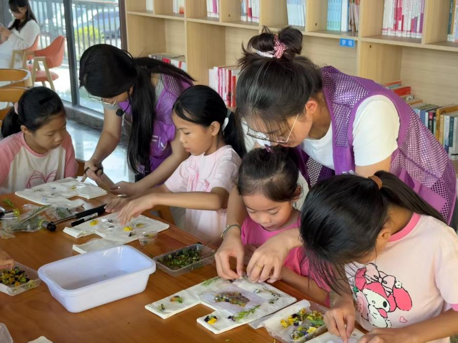拓印天,把非遗“花”朵背回家为了让花朵“鲜活”绽放,陈映晔等老师们精心挑选并提前半小时用明矾水仔细浸泡过。这样处理后的花瓣更柔韧舒展,形态保持得更好,拓印在包包上才能栩栩如生。桌子前,同学们专注地化身“小小印染师”。帆布包覆上老师提前处理好的花朵,摆放好位置,均匀轻捶娇艳的花朵轮廓渐渐在布面上清晰浮现,形态饱满生动。原本朴素的帆布包,变承载着非遗技艺的“移动小花园”。同学们迫不及待地展示自己亲手拓印的花朵包包,让古老技艺与现代生活碰撞出美妙的火花。
