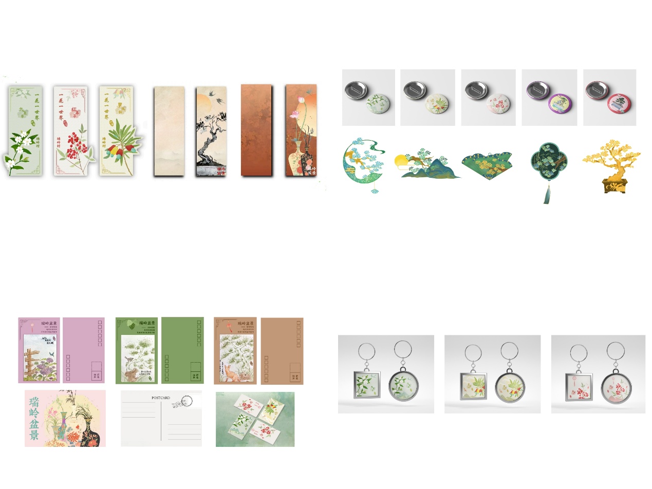 实践团根据瑞岭村的盆景特色、盆景元素,并结合地域文化特色进行创作,设计了独具特色的明信片、胸针、钥匙扣、书签以及冰箱贴等文创产品,通过文创产品展现瑞岭村盆景的独特魅力。