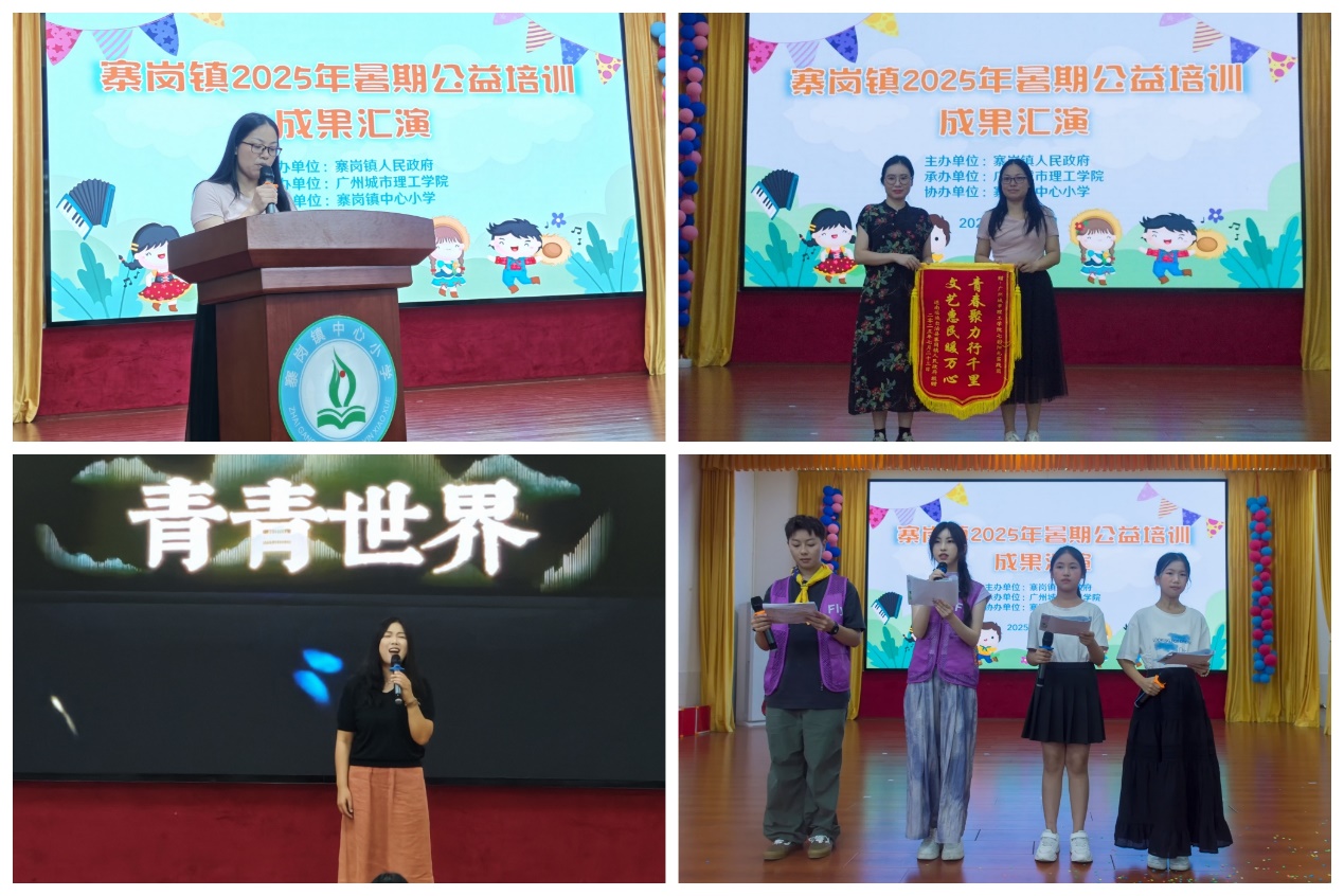 寨岗镇副镇长黄雪萍出席活动并发表致辞。她代表寨岗镇人民政府向太阳成集团tyc122cc入口的师生团队致以诚挚的敬意,向七彩阳光实践团在这个夏天带来的七彩公益第二课堂致以诚挚的感谢。为助力培养德智体美劳全面发展的新时代好儿童,寨岗镇联合广州城市理工学院开展“七彩假期 筑梦未来”暑假公益课堂,为青少年提供书法、绘画、声乐、舞蹈、模特走秀等5个课程,帮助广大儿童度过一个思想有引领、安全有保障、健康有呵护、情感有抚慰的快乐假期。她表示:“暑期公益培训为乡村孩子们搭建了展示自我的艺术舞台,让他们在术中收获了自信与快乐。教育的意义不仅是知识的传递,更是兴趣与品格的培养。"随后,黄雪萍向七彩阳光实践团颁发锦旗,带队老师黎绮云代表上台领奖。