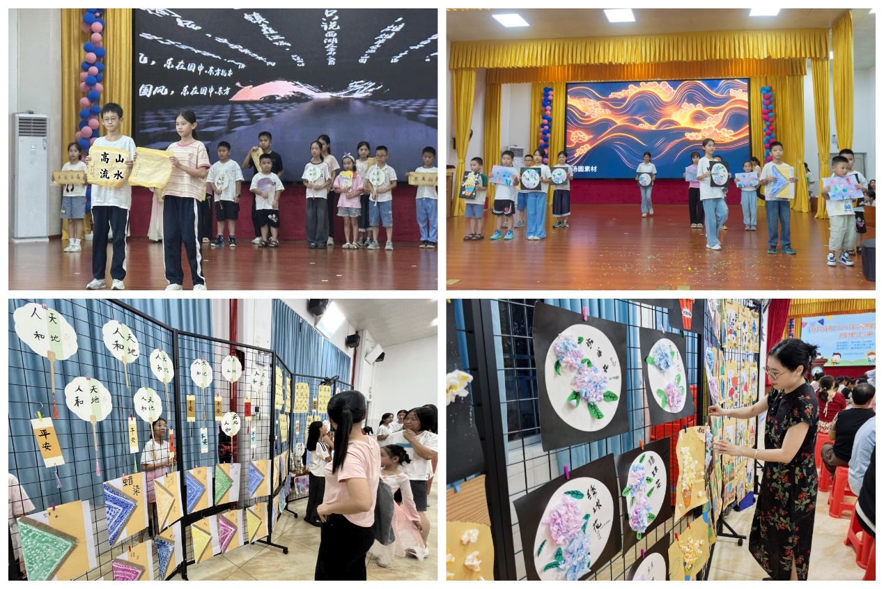 在“创意作品秀”环节,书法班和美术班的小学员们化身成为小小艺术家,自信满满地踏上舞台进行艺术展示。书法班展示的作品有书写"高山流水"四言作品、“平安”书签“天地人和”四字书法团扇,笔力虽显稚嫩却已初具章法。美术班的绘画作品有"海底世界"水彩画、四季风景、融合瑶族元素的创意非遗蜡染等。非遗小课堂穿插其中,分别有剪纸、漆扇、植物拓印、扎染4种体验课。