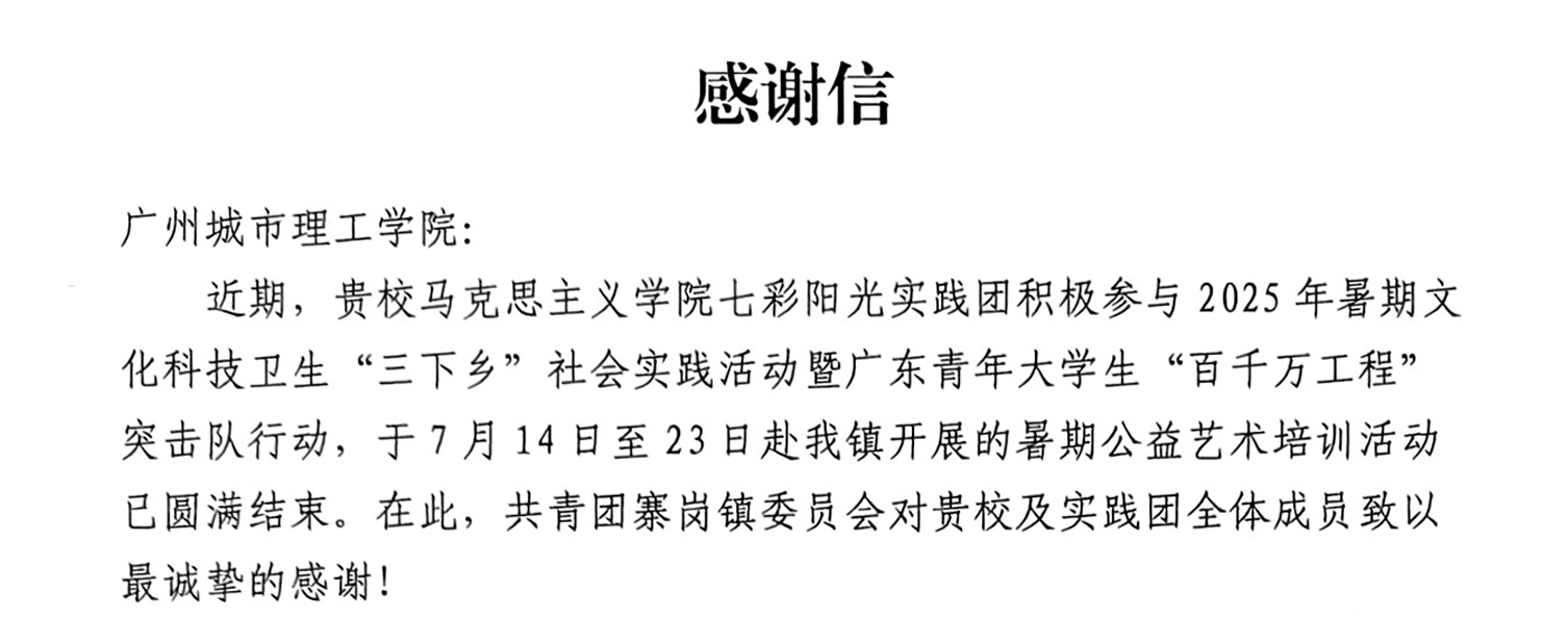 本网讯(记者 黎绮云)近日,广州城市理工学院收到一封情真意切的感谢信,寄信方是共青团清远市连南瑶族自治县寨岗镇委员会。信中高度赞扬了该校马克思主义学院七彩阳光实践团在2025年暑期“三下乡”社会实践暨广东青年大学生“百千万工程”突击队行动中的实践活动。