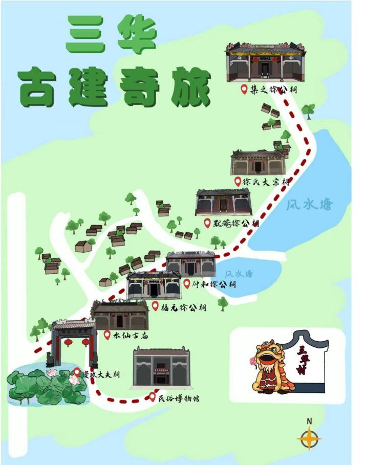 为打造受年轻受众喜爱的集章打卡旅游路线,实践团成员连续一周在三华村多次进行实地考察,详细记录村风村貌与景点位置,最终设计出了以“三华古建奇旅”为主题的手绘地图,涵盖“民俗博物馆-资政大夫祠-水仙古庙-福元徐公祠-仲和徐公祠-默庵徐公祠-徐氏大宗祠-集之徐公祠”等景点,风格卡通清新,兼具地域性、标志性和故事性,得到三华村团委书记李嘉茵的高度认可。