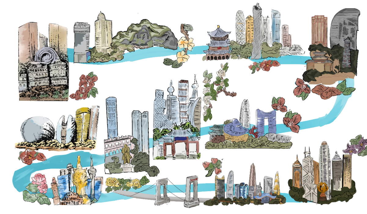 整幅墙绘用灰塑工艺的肌理以广东西江的流向串联起各大城市(从发源地肇庆出发,流经江门、珠海,连通澳门,途经广州、东莞、深圳、惠州后,水流分支入中山,汇入佛山,最终通过珠江河口与香港相连,从而勾勒出独特的城市脉络),又用代表性花卉点缀每个城市,彰显各自特色。郑喻元同学表示,此设计受到国家级非遗灰塑代表性传承人邵成村老师的启发,他说道:“邵成村老师在接受Young实践团采访时提及岭南灰塑与现代建筑的结合难题,而三华古村要开发商业街区,也存在过渡和衔接的困境。我们设计的这组墙绘让岭南灰塑与现代建筑穿越古今,完美融合,既是对技术难题攻克的期许,也是对传统工艺的创造性表达。”