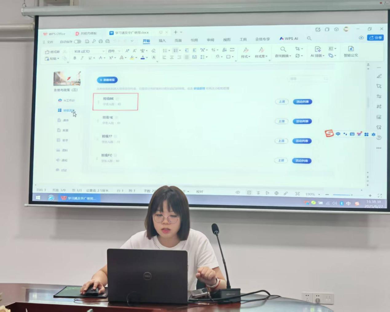随后,为帮助形势与政策课程组新教师快速掌握信息化教学工具,提升课堂教学效率与互动质量,宋璐瑜老师开展了学习通使用专题培训,助力新教师尽快适应教学工作。宋璐瑜老师从学习通的核心功能与实操技巧两方面展开讲解。针对课程备课环节,她详细演示了教学资源上传、课件同步、作业题库搭建的操作流程,重点介绍了如何快速更新课程资料、设置分层作业。在课堂互动模块,她通过模拟教学场景,展示了签到、抢答、随堂测试等功能的使用方法,指导新教师如何借助教学工具调动学生课堂积极性,及时掌握学生学习反馈。针对课后管理,她还分享了成绩统计、学情分析、线上答疑的实用技巧,帮助新教师高效完成教学闭环。