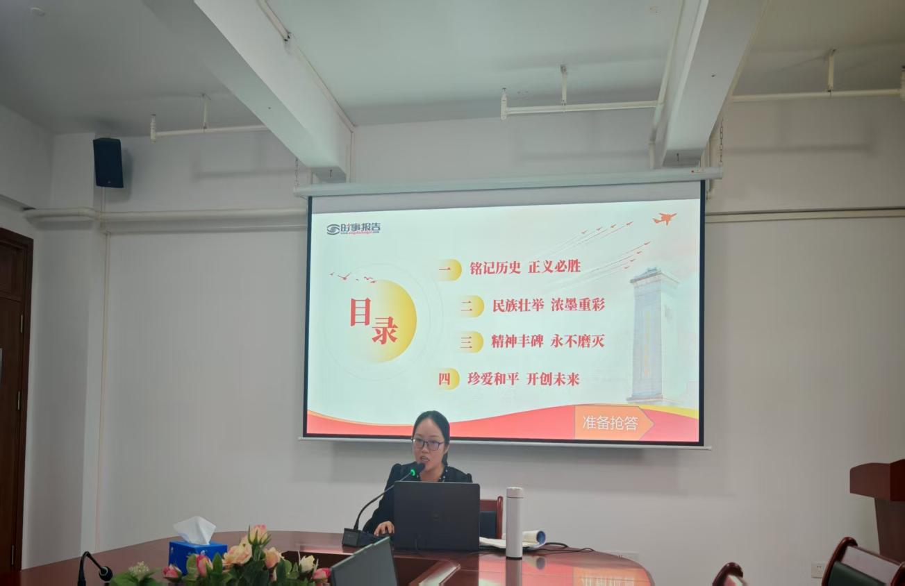 在专题讲解环节,欧阳娟老师以《纪念抗战胜利 坚定民族信念》为主题,呈现了一套多元立体的教学设计。她通过“测、讲、议、练”多元环节,将历史认知与思政育人深度融合,为专题教学注入生动活力。其中,“课前小测”围绕“抗战起点”、“日本投降时间”等问题调动学生兴趣;课堂教学按“铭记历史——民族壮举——精神丰碑——开创未来”的顺序一一展开,结合教材重点与详实数据,解析 14 年抗战的艰辛曲折、中国共产党中流砥柱作用及世界反法西斯战争中东方主战场的重要地位和贡献,还辅以“七三一部队”、“刘老庄82壮士”等短视频,增强学生直观感受,并通过“抗战胜利决定性因素”、“如何驳斥二战胜利‘西方决定论’”、“新时代弘扬抗战精神”等讨论题与《南京照相馆》等影视资源,让学生直观感受历史厚重与民族精神,使课堂更具感染力。欧阳娟老师指出,抗日战争的胜利开辟了中华民族伟大复兴的光明前景,开启了古老中国凤凰涅槃、浴火重生的新征程,蕴含着伟大的抗战精神,是中华民族弥足珍贵的精神财富。在教学中,要引导学生铭记历史,缅怀先烈,坚定民族信念,激发学生的爱国热情和责任感。